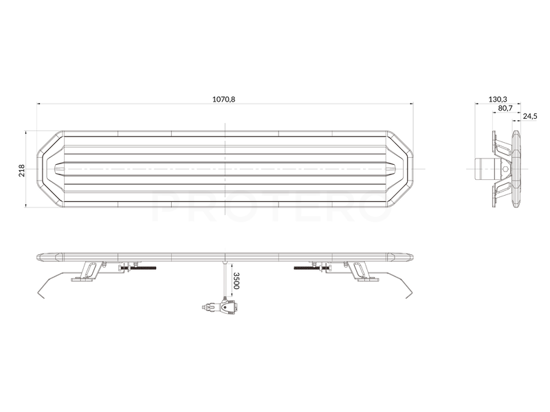 Varsellysbjelken er 1070 mm bred, 218 mm dyp og har en høyde på 24.5 mm uten festebrakett (80.7 mm med festebrakett)